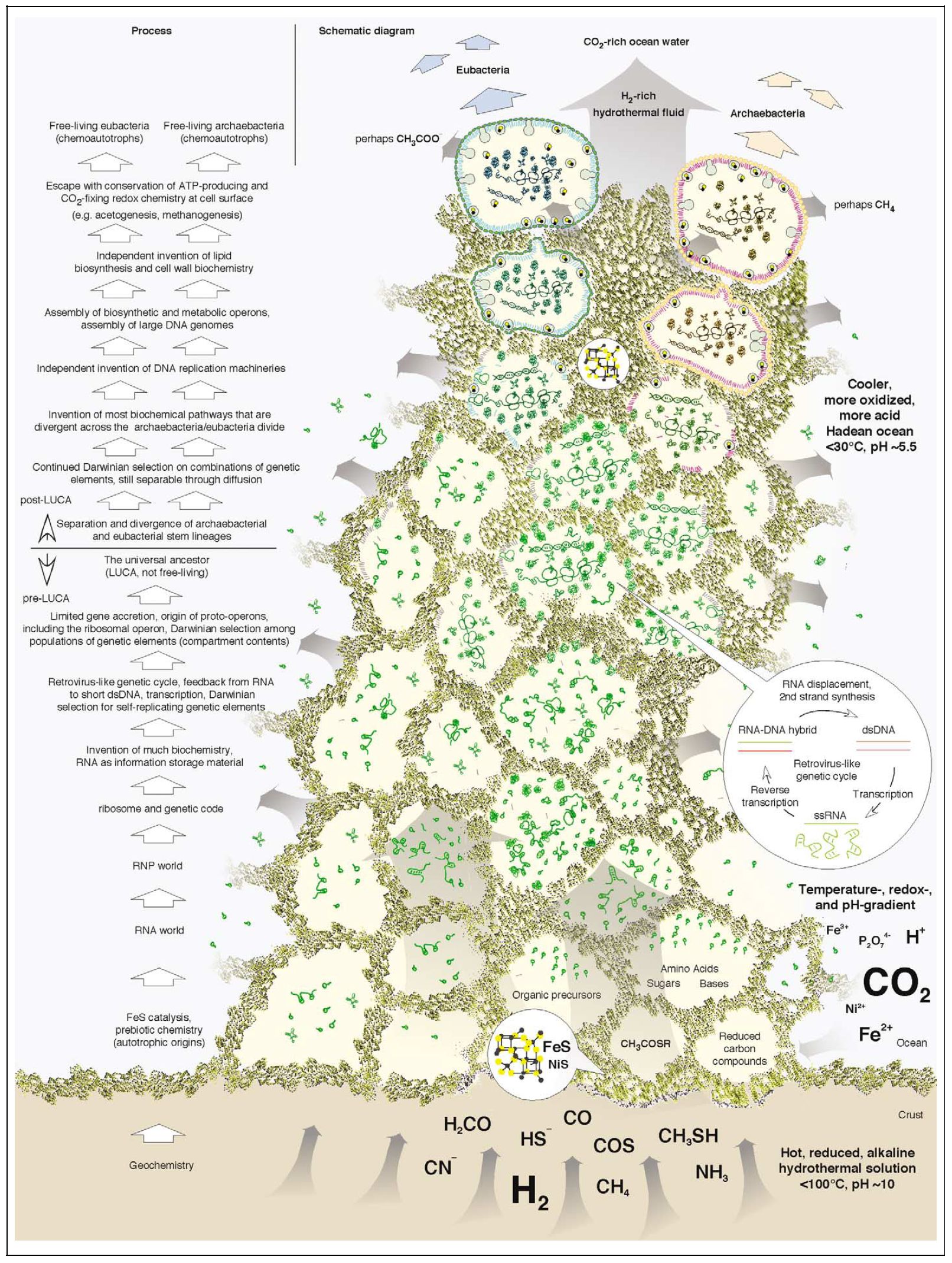 Okyanus tabanındaki bu termal bacalar kimyanın biyolojiye dönüşünde ve canlılık dediğimiz hayat döngüsünün başlamasında destekleyici özellikler taşıyordu. Okyanus tabanındaki termal bacalar her açıdan yaşamın ortaya çıkışını destekleyecek nitelikte olup sıcak yeraltı sularındaki methan, amonyak, fosfor-kükürt-hidrojen gibi çeşitli bileşimleri bünyesinde toplayabiliyordu. Bu poröz özellikleri sayesinde hem volkanik bölgelerden gelen ham madde ve indirgen bileşiklerce zengin, hem de kristal yüzeylerin ve mikroskopik odacıkların bulunduğu gözenekli yapıları ile ilk kataliz reaksiyonlarının ve kimyasal tepkimelerin gerçekleştiği ve de hücresel bileşenlerin korunduğu bölgelerdi. Bu basit bileşenler bu labaratuvar sisteminde daha sonra şeker, aminoasit ve nükleitler gibi daha kompleks çeşitli organik bileşenleri oluşturacaktı.