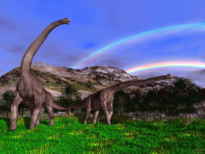 Der – Armsaurier • Brachiosaurus lebte in der Kreidezeit vor 153 bis 113 Mio Jahren. Die Fundorte seiner Skelette liegen in Portugal, Algerien, Tansania sowie in Colorado, Utah und Wyoming ( USA ) . Brachiosaurus war einer der größten und schwersten Dinosaurier, die je gelebt haben ( Länge 25 Meter, Gewicht bis zu 50 Tonnen ! , das entspricht etwa 25 Nashörnern ) . Allein der Knochen seines Oberarms war so lang, wie ein erwachsener Mensch groß ist. Brachiosaurus ernährte sich von diversen Pflanzen, wie Nadelgewächsen, Baumfarnen und Farnen. Einige Wissentschafter vermuten, dass viele Dinosaurier wie Vögel und Säugetiere zu den gleichwarmen Tieren gehörten. In diesem Fall hätte ein Brachiosaurus täglich etwa 200 Kilogramm Pflanzen fressen müssen, um seine Körpertemperatur zu halten • das wäre jedoch sehr zeitaufwendig gewesen. Auf der anderen Seite haben die Forscher errechnet, dass kaltblütige Brachiosaurier dann etwa 100 Jahre bis zum ausgewachsenen Zustand gebraucht hätten.