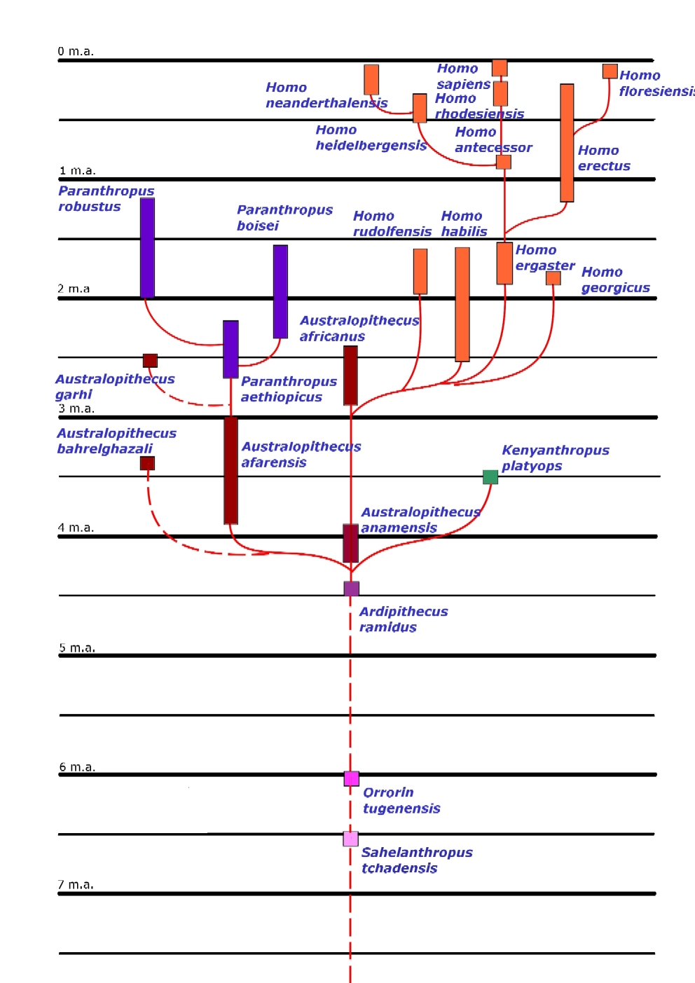 Im Jahr 2000, zur Jahrtausendwende, stoßen Forscher in Kenia auf Knochenfunde, die die Fachwelt aufhorchen lassen: Sie gehören zu einem Wesen, das etwa so groß wie ein Schimpanse gewesen sein muss und das zumindest zeitweise bereits aufrecht auf zwei Beinen ging. Seine Nahrung kaute es mit Kiefern und Zähnen, deren Struktur der unseren recht ähnlich ist. Kurzum, es handelte sich um die Überreste eines Hominiden, also eines Vormenschen. Nun hatte man davon bereits viele gefunden, aber die Überraschung war, dass die Datierung ein Alter der Knochenfunde von ca. 6 Mio. Jahren ergab. Damit schien dieser rasch „ Millenium-Mensch „ , mit wissenschaftlichem Namen Orrorin tugenensis, getaufte Hominide unser ältester Vorfahr zu sein, und der überlieferte Stammbaum der Hominiden konnte plötzlich weiter als je zuvor zurückverfolgt werden. Bis dahin hatte ein Fund aus dem Jahr 1994 als der älteste Hominidenfund gegolten: Ardipithecus ramidus, 4,4 Mio. Jahre alt bzw. vergleichsweise jung. Inzwischen hegen einige Wissenschaftler jedoch Zweifel, ob Orrorin tugenensis überhaupt in unsere Ahnenreihe gehört.