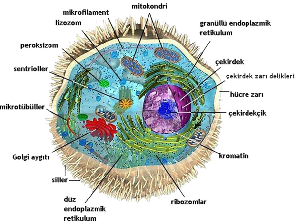 Hücre Yapısı: 1)Çekirdekçik 2) Çekirdek 3)Ribozom 4)Vezikül 5)Granüllü (Tanecikli)Endoplazmik Retikulum 6)Golgi Aygıtı 7)Sitoiskelet 8)Granülsüz (Düz) Endoplazmik Retikulum 9)Mitokondriler 10)Koful 11)Sitoplazma 12)Lizozom 13)Sentriyoller