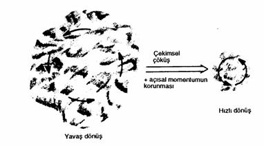 bulutun gerisinde kaldılar. Bunun sonucunda başlangıçta dağınık olan bulut neredeyse bir bisiklet tekerleği gibi dönen ve merkezinde daha sonra Güneş’in atası haline gelecek yoğun bir gaz topu bulunduran bir diske dönüştü (Şekil 3).