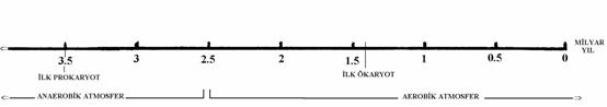 Çevremizde gördüğümüz organizmalar, hayvanlar, bitkiler ve mantarlar, organizmanın bütünlüğü içinde farklı işlevler görmek üzere özelleşmiş hücrelerden oluşur. Çok hücreli organizmalarda bulunan bu hücrelere ökaryot hücreler adı verilir. Ökaryot hücrenin genetik malzemesi bir çekirdek içindedir. Bu hücrelerde organel adnı alan, zarlarla çevrili, özelleşmiş iç organlar bulunur. Genellikle her organel türünün ayrı bir biyokimyasal işlevi vardır. Bakterilerde bulunan prokaryot hücre, ökaryot hücrenin tersine, ondan belirgin şekilde daha küçüktür. Bu hücre çekirdeksiz olup az sayıda organel içerir. Genetik malzemesi bir zarla çevrili değildir ve hücre protoplazması içine dağılmış durumdadır. Biyokimyasal işlevlerin çoğu hücre çeperinin iç zarında gerçekleşir. Basit yapısı, prokaryot hücrenin ökaryot hücreye gö- re daha ilkel olduğunu göstermektedir. Fosil kayıtları da bu düşünceyi desteklemektedir. Kayaçlarda bulunan ve görünüşe göre prokaryot olan mikropların fosilleri 3.5 milyar yıl yaşındadır. Oysa şimdiye kadar bulunan ve deneysel olarak büyüklüklerine göre tanımlanan en eski ökaryotlar, sadece 1 milyar 400 milyon yaşındadır. Bilindiği gibi, ökaryot hücrelerden oluşan bütün organizmalar zorunlu olarak aerobiktir (havacıl); yani yalnızca serbest oksijen bakımından zengin ortamlarda yaşayabilirler. Prokaryotlar ise bunun tersine oksijene tam bir tepki çeşitliliği gösterirler. Bazıları zorunlu anaerobiktir (havasız yaşar). Oksijene maruz kaldıklarında ölürler. Diğerleri de zorunlu aerobiktir. Bazıları çevrelerinde bir miktar oksijene gerek duyabilir ya da bunu tolere edebilirse de bu miktar, günümüzde havada bulunan oksijen kadar çok değildir. Maruz kaldıkları oksijen miktarından etkilenmeyen prokaryotlar da vardır. Kimi prokaryotlar oksijensiz bir ortamda evrilmiş ve bu ortama uyum sağlamışken, ökaryotlar aerobik koşullarda ortaya çıkmış ve evrilmişlerdir. Ökaryot hücrenin ortaya çıktığı sırada, Yer üzerinde bol miktarda oksijen olması gerekir. 3.5 milyar yıldan önce yani yaşamın başladığı sıralarda ise oksijen yoktu. Bu tarihler arasında bir yerde atmosfer aerobik hale geldi, (Şekil 5).