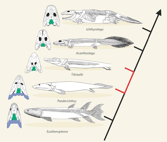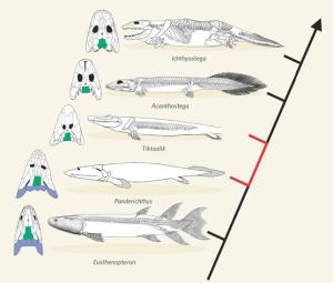 Der Übergang der Wirbeltiere von einer aquatischen Lebensweise zum Leben an Land am Ende des Devons (vor etwa 385 – 360 Mio. J.) ist mittlerweile sehr gut durch Fossilfunde belegt. Die wohl spektakulärsten Funde der letzten 30 Jahre waren die Entdeckung eines nahezu vollständig erhaltenen Fossils von Acanthostega 1987 durch Jennifer Clack (auch wenn dieser Genus durch Schädelfragmente schon vorher bekannt war) und die Entdeckung von Tiktaalik durch Ted Daeschler und Neil Shubin 2004 (für Literaturreferenzen siehe: ‘Übergangsformen: Zu Lande, zu Wasser und in der Luft‘).