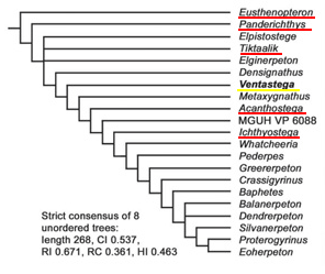 Because of its phylogenetic position and character complement it is tempting to interpret Ventastega as a straightforward evolutionary intermediate, which represents with reasonable accuracy the character complement of the tetrapod stem lineage at a point on the internode between Tiktaalik and Acanthostega. However, this simple picture should be approached with a degree of caution. ANSP 21350 and Elginerpeton in particular […] show character combinations that are substantively different from those of Ventastega and Acanthostega without being obviously autapomorphic, and both probably occupy deep positions in the phylogeny. At a minimum this demonstrates the presence of considerable morphological diversification among the earliest tetrapods. More importantly, however, the discovery of articulated material of these or similar forms could have a substantial impact on the tree topology. Ventastega, like Tiktaalik, conforms remarkably well to prior expectations of what a transitional form at that particular point in the phylogeny should be like; whether the same will be true of future discoveries remains to be seen.