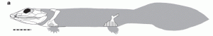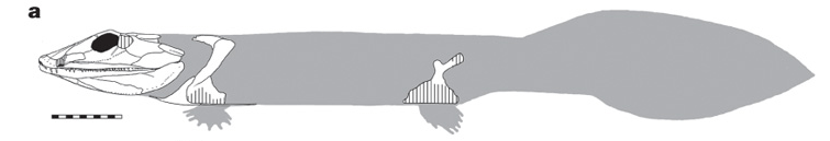 Auch Acanthostega hatte wohl eine rein aquatische Lebensweise, war aber schon ein echter Tetrapod, wenn auch mit vielen Fisch-ähnlichen Eigenschaften (einen ausführlichen und sehr interessanten Bericht über Acanthostega und den Übergang an Land gibt’s bei Scientific America: ‘Getting a leg up on land‘ von Jennifer Clack).