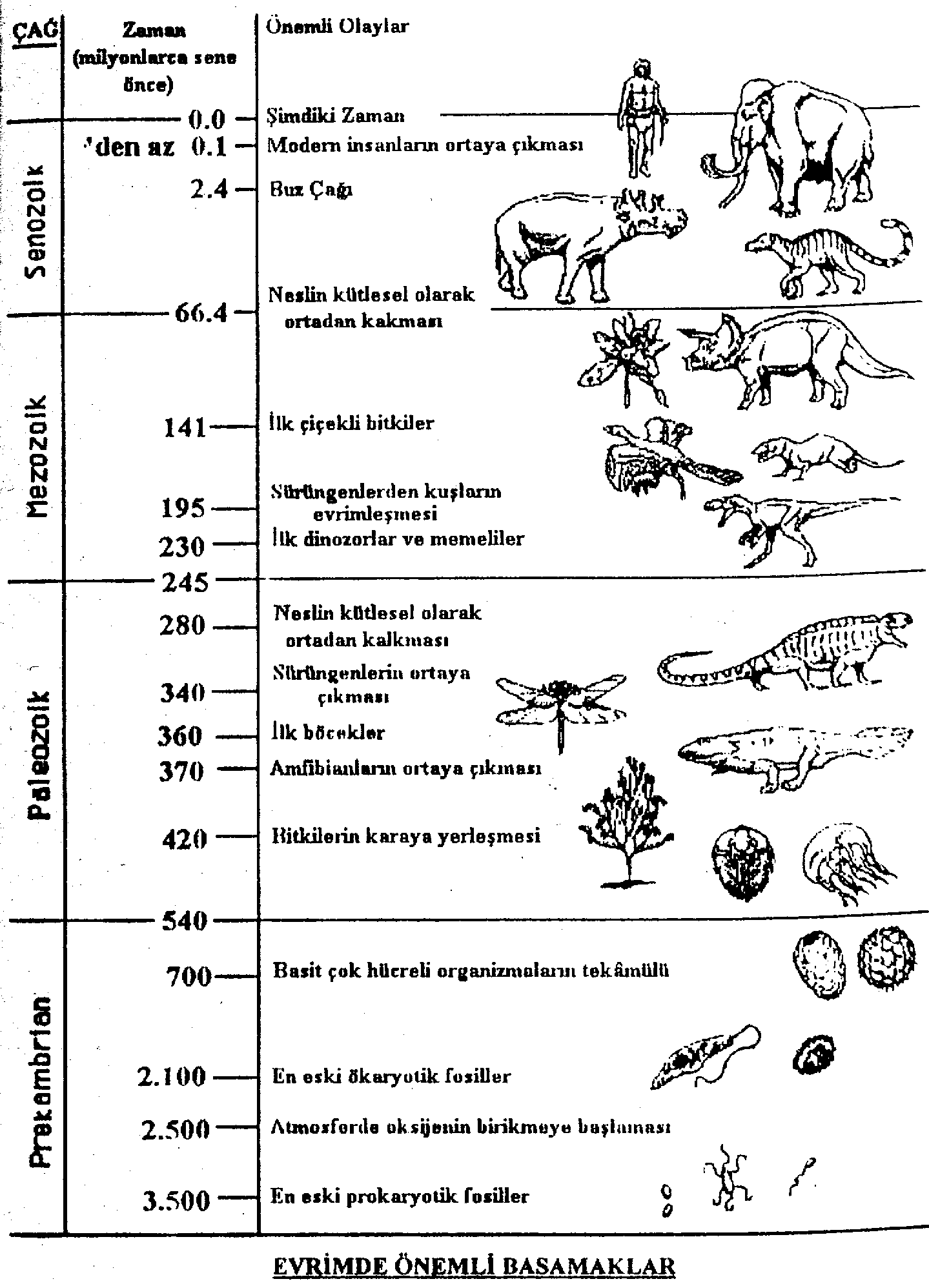 Çizelge 1. Jeolojik zaman ölçeği. Yaş ve süre milyon yıl olarak verilmiştir. Paleozoic çağ çizelgeye