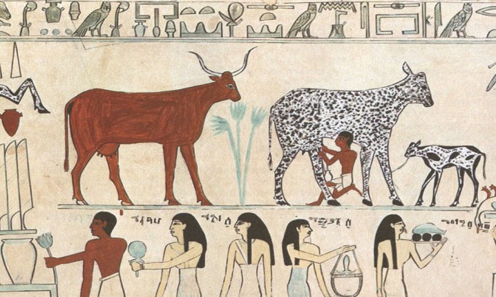 Mısır’da insanın ineği ehlileştirip onun sütünden istifade etmekte oluğunu gösteren çok sayıda kayıt bulunmaktadır. Çatalhöyük de, yeryüzündeki en eski insan yerleşimlerinden biridir. Burada yaşayan halkın köpek ile birlikte koyun ve keçiyi de evcilleştirmiş olduğunu, yabani sığır, yabani at, eşek, domuz ve geyik gibi hayvanları avladıklarını, özellikle de at ve sığırın törenlerde ziyafet sofralarını süsleklerini biliyoruz.