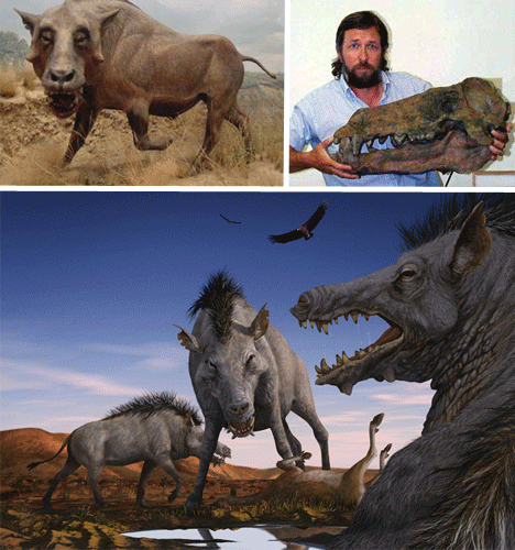 “Cehennem domuzu, Terminatör domuz” (yukarıdaki resim) gibi lakaplarla çağırılan bu canlının adı Entelodont ve yaklaşık yarım ton ağırlığa sahip. Kendi ismini taşıyan özel bir kurşunla öldürülen (domuz kurşunu) tek canlının domuz olduğunu ve çiftçilerin bugün 50-100 kiloluk versiyonlarıyla bile başedemediğini düşününce insanın ister istemez “iyiki soyu tükenmiş” diyesi geliyor.