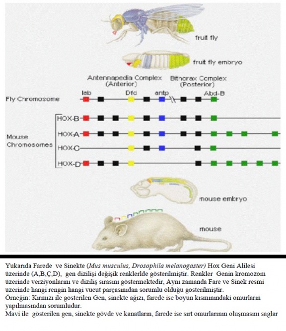 Hoxc8 geninin insanda, şempnzede, farede, tavukta ve piton değişik varyasyonları bulunur. Farede genin uzunluğu 1485 harf, tavukta 765 harf, insanda 2290 harf, şempanzede ise 2295 harf uzunluğundadır. Bu gen “farede 7 boyun 13 göğüs kemiği”, “tavukta 14 boyun 7 göğüs kemiği”, “piton yılanında ise baştan başlayarak tüm vücutta omugaların oluşmasını sağlar. (2)