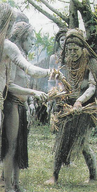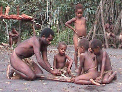 Papua-Yeni Gineli kadınlar, kor halindeki kütükleri elden ele geçiriyorlar.