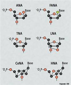 Grafikte gösterilen ve FANA gibi florin atomu gibi spesifik yapıya sahip olan XNA’lar, DNA ve RNA’nın yapısını kopya ediyor ve aynı fonksiyonları gösteriyor. Ancak ortaya tamamen yeni ve yapay genetik yapılar çıkıyor.
