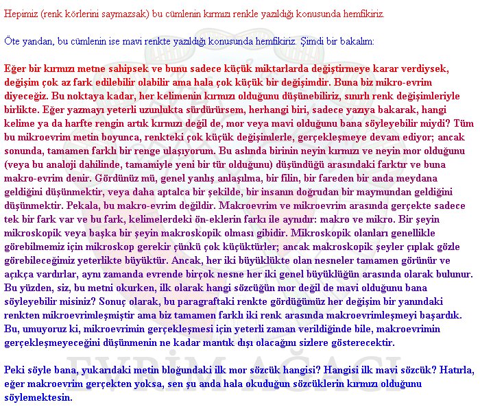 Hepimiz (renk körlerini saymazsak) bu cümlenin kırmızı renkte yazıldığı konusunda hemfikiriz. Öte yandan, bu cümlenin ise mavi renkte yazıldığı konusunda hemfikiriz. Şimdi bir bakalım: Eğer bir kırmızı metne sahipsek ve bunu sadece küçük miktarlarda değiştirmeye karar verdiysek, değişim çok az fark edilir olabilir ama hala çok küçük değişimdir. Buna biz mikro evrim diyeceğiz.