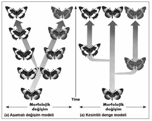 Ben kendimi, değişimin düzgün şekilde aşama aşama değil, sıçramalı ya da epizodik şekilde yaşandığını öne süren evrimciler arasında sayıyorum. 1972’de, çalışma arkadaşım Niles Eldredge ile birlikte kesintili denge kuramını geliştirdik. Fosil kaydının önemli iki olgusunun -yeni türlerin jeolojik olarak “aniden” ortaya çıkışının ve ardından uzun süreli değişmezlik dönemlerinin (stasis)- fosil kayıtlarındaki eksiklik ve kusurları değil, evrimci kuramın öngörülerini yansıttığını öne sürdük. Kuramların çoğuna göre küçük popülasyonlar yeni türlerin kaynağıdır ve türleşme süreci binlerce ya da on binlerce yılı kapsar. Bizim yaşamlarımızla ölçüldüğünde bu denli uzun olan zaman süresi, jeolojik olarak bir mikro saniyedir. Bu da, omurgasız bir türün fosilinin on milyon yılı aşkın yaşam süresinin yüzde birinden azına denk düşer. Öte yandan, büyük, geniş alanlara yayılmış ve istikrarlı bir yapıya sahip türlerin pek fazla değişmesi beklenemez. Geniş popülasyonların devinimsizliğinin ve durağanlığının (inertia), çoğu fosil türlerinin milyonlarca yıl değişmeden kalışlarını (stasis) açıkladığına inanırız.