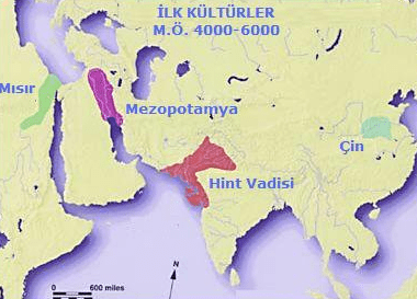 O zamana kadar bilinen en eski kültürler aşağıdaki haritada gösterilmiştir. İlk olarak 7-8 bin yıl önce Dicle ve Fırat arasındaki bereketli topraklarda Ubaid kültürü oluşmuştur. Bunu Sümerler (M.Ö. 3500), Nil çevresinde Mısır, İndus nehri kıyılarında Harappanlar ve Huanghe (Sarı Irmak) çevresinde yaşayan Çinliler takip etti. Sarı Irmak Çinlilerinin birleşerek devlet olmaları ancak M.Ö. 1700’de mümkün oldu.