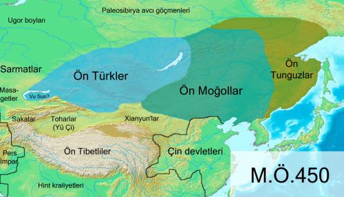 M.Ö. 450’ye kadar Türklerin atalarının Kuzey Sibirya taygalarında yaşadığı kabul edilir. Bu tarihten itibaren güneye, Moğolistan’a ve Orta Asya’ya doğru hareket ederek o bölgede yaşayan Hint-Avrupa halklarını topraklarından çıkardıkları, bir kısımını asimile ettikleri düşünülmektedir.