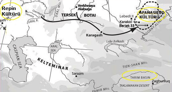 Aynı dönemde (M.Ö. 3200-1700) Orta Asya’da tunç çağını yaşayan Afanasyevo kültürü vardı. Altay dağlarının kuzeyindeki bozkırlarda gelişen bu kültürün, avcılık, hayvancılık, taştan ve bakırdan eşyalar yaptıkları bilinmektedir. Kurganlardan edinilen bilgilere göre kartalı kutsal bir hayvan olarak kabul etmişler, pençesini mezarlara koymuşlar ve mezar taşlarına da kartal şekli oymuşlardır.