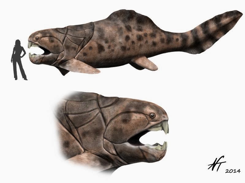 Dunkleosteus 9 metrelik etçil bir canlıydı. Köpek balıkları ondan daha uzun süre sonra da yaşamaya devam ettiler, ancak eminim ki bu canavarın yediği canlıların çeşitliliğinin yanında bu sadece küçük teselli idi onlar için. Tıpkı günümüzde kaplumbağalarda olduğu gibi diş yerine, kemikli çıkıntılara sahipti. 1 cm kare başına 1500 kg’lık bir ısırık kuvvetine sahip olmaları onları timsahlar ve T-Rex ile tarihteki en güçlü ısırıklar kategorisinde aynı sıralamaya koyar.