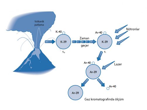 Karbon-14’ün tarihlendirmediği daha eski tarihleri için ne yaygın tekniklerden bir diğeri olan potasyum-argon kullanılır. 40Potasyum argon-40’a dönüşebilen potasyumun radyoaktif bir izotopudur. Potasyumun yüzde 0,01’ini oluşturan radyoaktif potasyum izotopu potasyum-40’ın yavaşça bozunarak bir soygaz olan argon-40 haline gelmesine dayanır. Volkanik kayaçlar potasyum içerirler ve kristal yapıları içerisinde argon-40 biriktirirler. Volkanik püskürmelerin yarattığı yüksek sıcaklık nedeniyle, argonun (ve diğer gazların) kayaçlardan çıkmasına neden olur ve saat sıfırlanmış olur. Zaman geçtikçe argon-40 o kayacın başlangıçtaki potasyum konsantrasyonuna ve püskürmeden beri geçen zamana bağlı olarak birikir. Yaşın hesaplanması da bu biriken argon-40 ölçümleriyle yapılır. 40Potasyum’ın yarılama ömrü karbon-14’e göre oldukça fazladır. 1,3 milyar yıl olan yarılama tarihi sayesinde çok eski fosillerin bile yaşlarını bilebiliyoruz. K/A yöntemi sadece inorganik maddelere (kaya, mineral vb.) uygulanabilir. Bu teknik Paleoantropoloji’de ilk kez 1960 yılında Olduvai Boğazı’ndaki kül tabakalarının değerlendirilmesi ile gerçekleşmiştir.