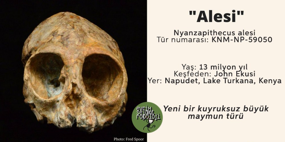 Şimdi bu soruları daha kapsamlı bir şekilde ele alabileceğiz. Çünkü araştırmacılar Alesi ismini verdikleri ve müze numarası KNM-NP 59050 olan yeni bir kuyruksuz büyük maymun fosili buldular. Bu fosil 13 milyon yıllık bir infant (bebek). 2014 yılında, Kenyalı fosil avcısı John Ekusi, Kuzey Kenya’daki Turkana Gölü’nün batısında Napudet bölgesinde 13 milyon yıllık bir kaya katmanı tespit etti.
