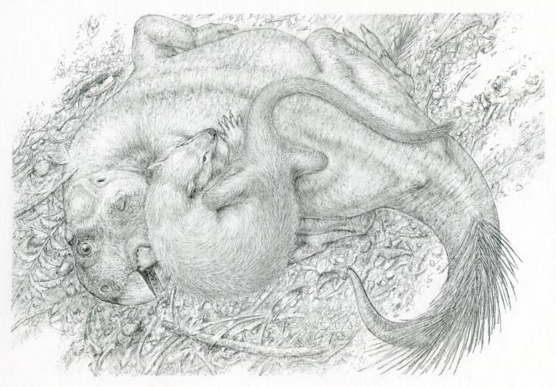İki hayvan ölümcül bir kavgada kilitlenmiş, çok yakın bir şekilde birbirine dolanmış durumda ve bu, bir memelinin bir dinozora karşı gerçek yırtıcı davranışını sergilediğini gösteren ilk kanıtlar arasında yer alıyor.