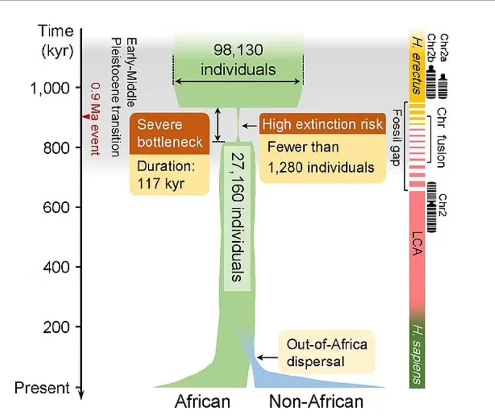“Sonuçlar, atalarımızın yaklaşık 930 bin yıl önce başlayan ve neredeyse 120 bin yıl süren ciddi bir nüfus darboğazı yaşadığını gösteriyor. Bu durumun üreyen birey sayısını bin 300’e düşürdüğü ve atalarımızı yok olmaya yaklaştırdığı tahmin ediliyor. Bu çalışma, erken dönem insan popülasyonlarının kırılganlığına odaklanarak, evrimsel soyumuzun neredeyse yok olduğu sonucuna varıyor.”